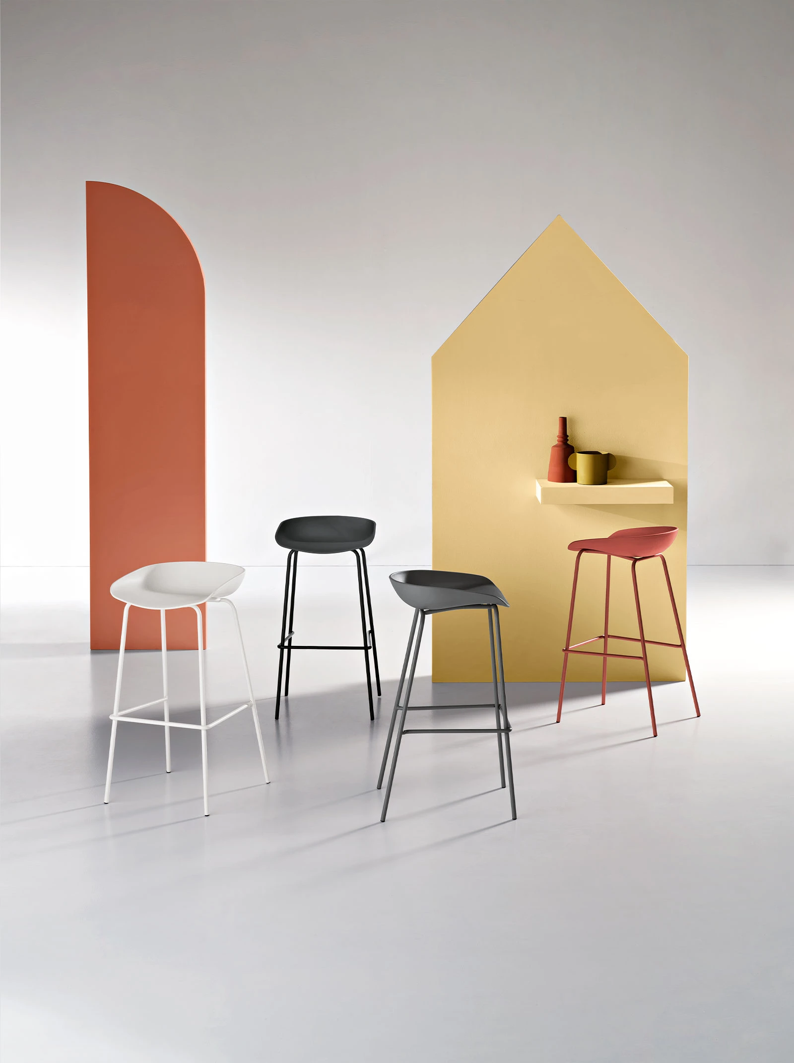Sgabello in polipropilene con struttura in metallo. Disponibile in diversi colori.