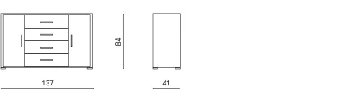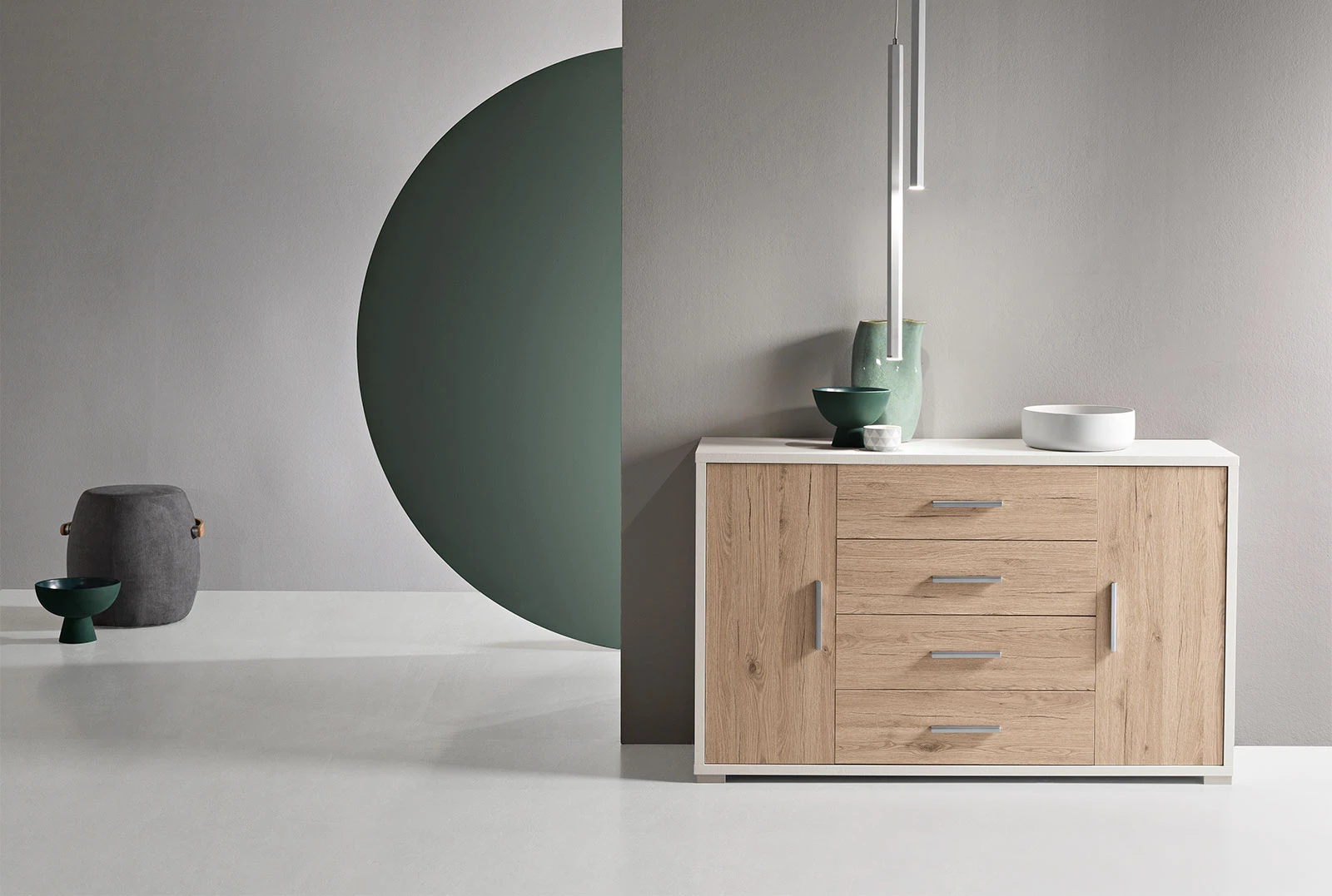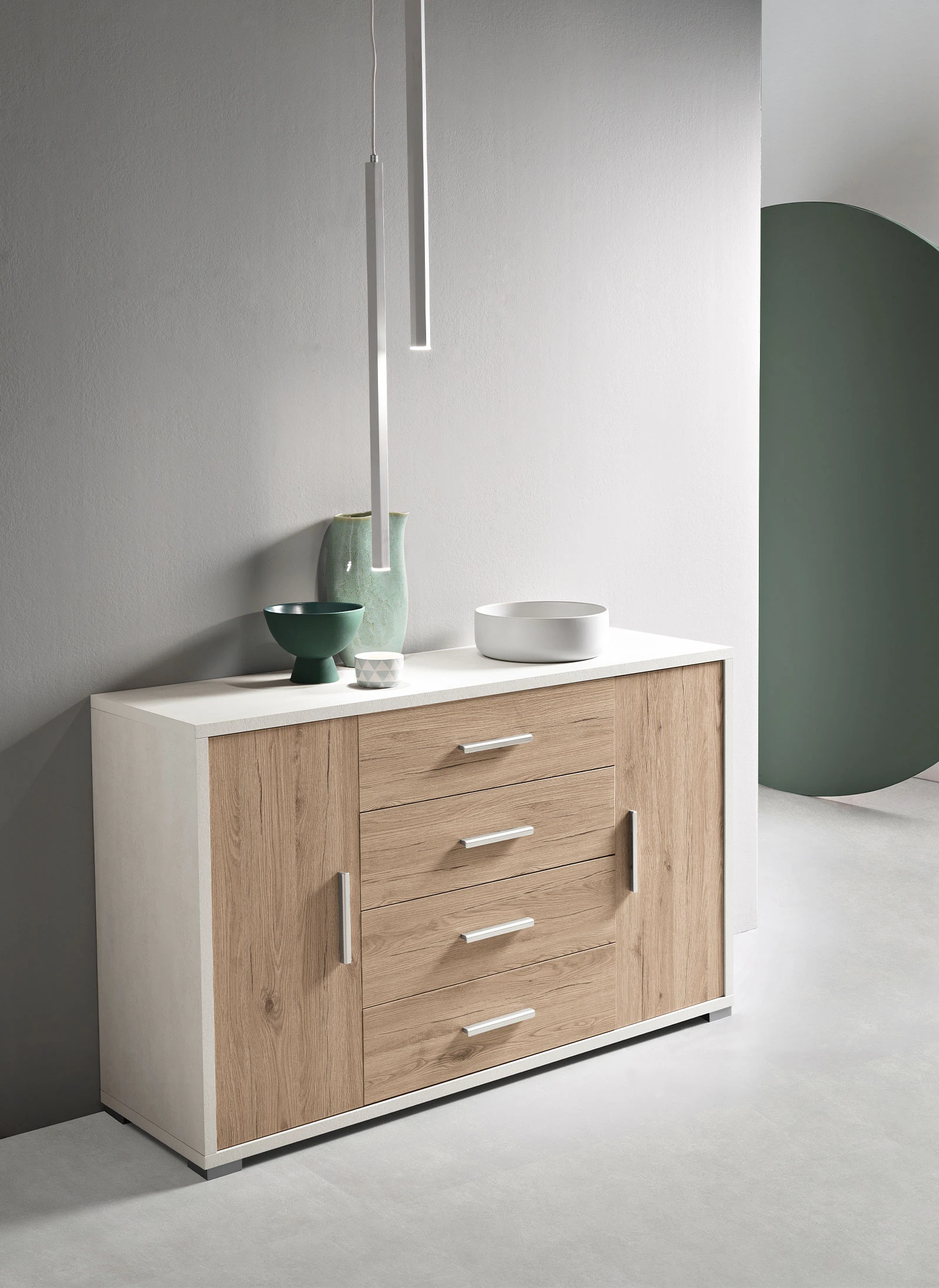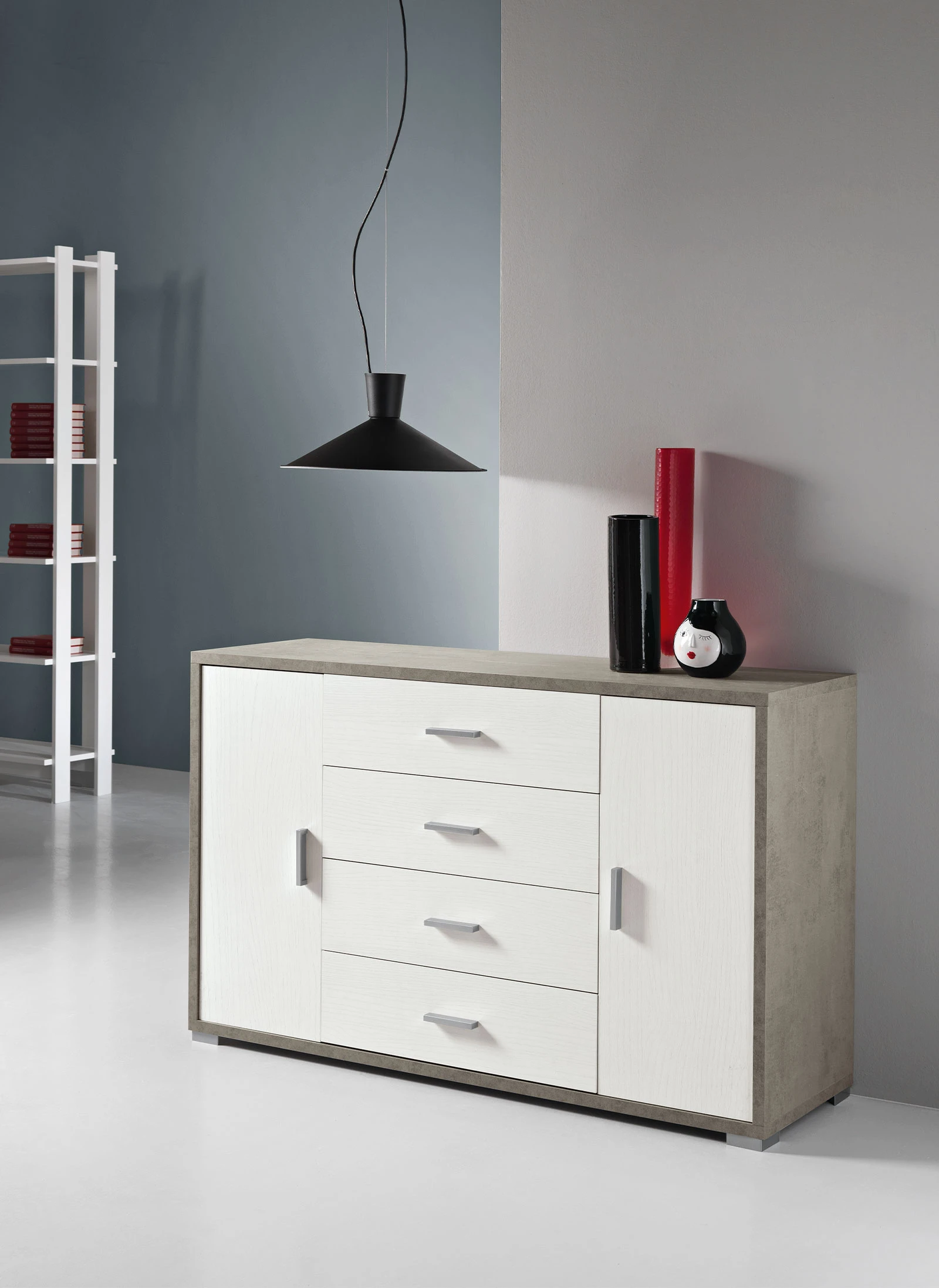 Madia in melaminico con due ante e quattro cassetti centrali. Piedini in ABS. Disponibile in diversi colori.