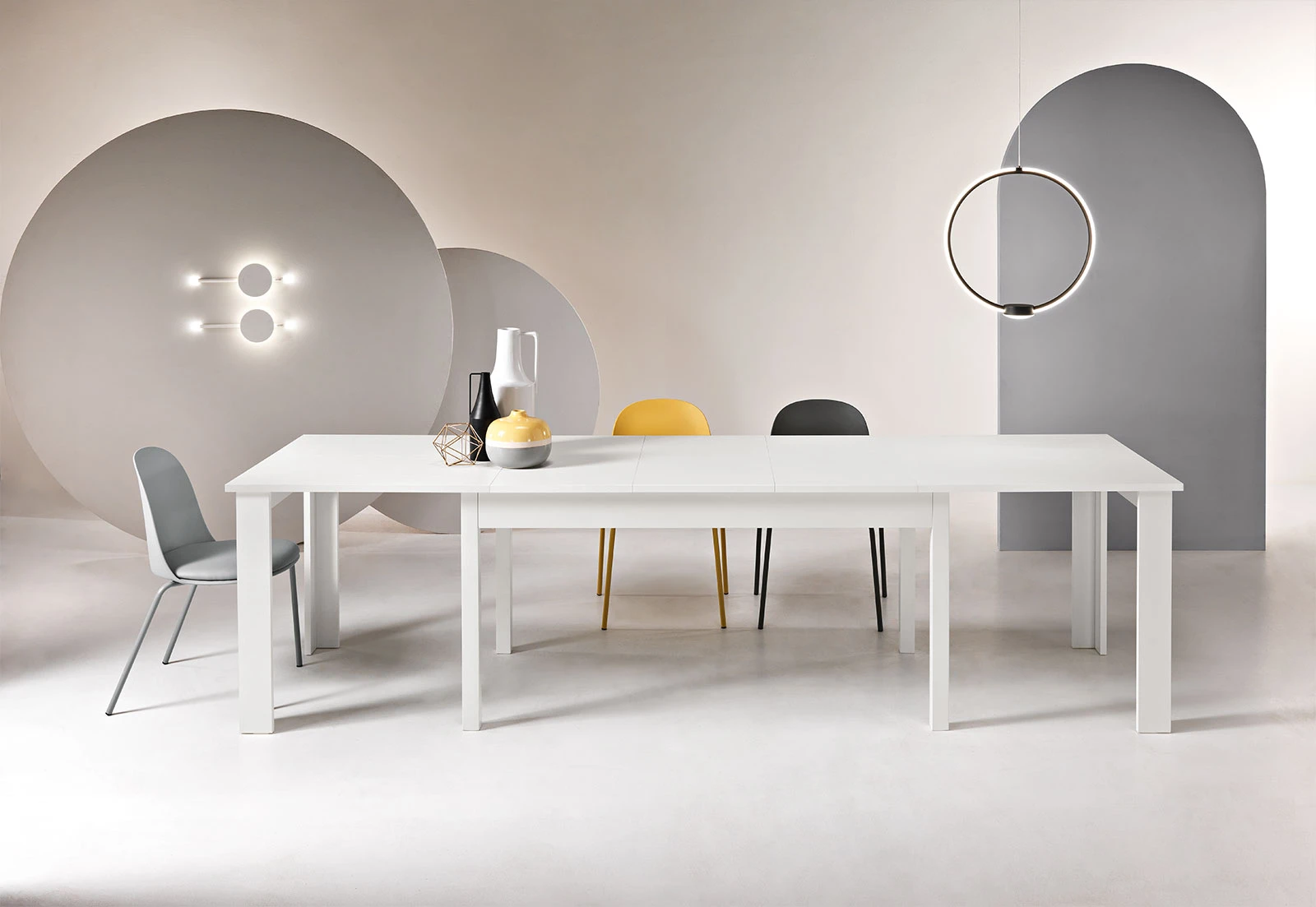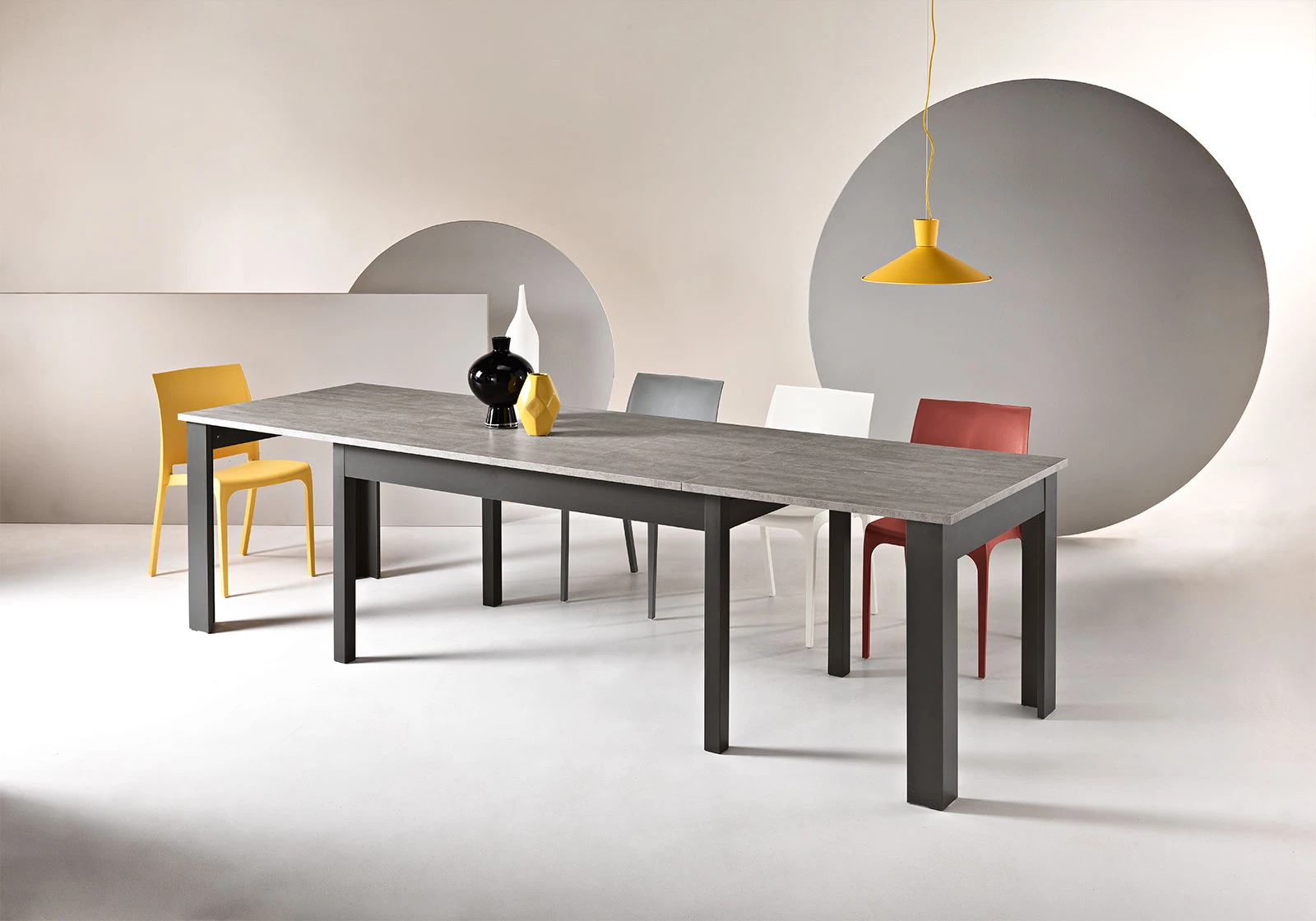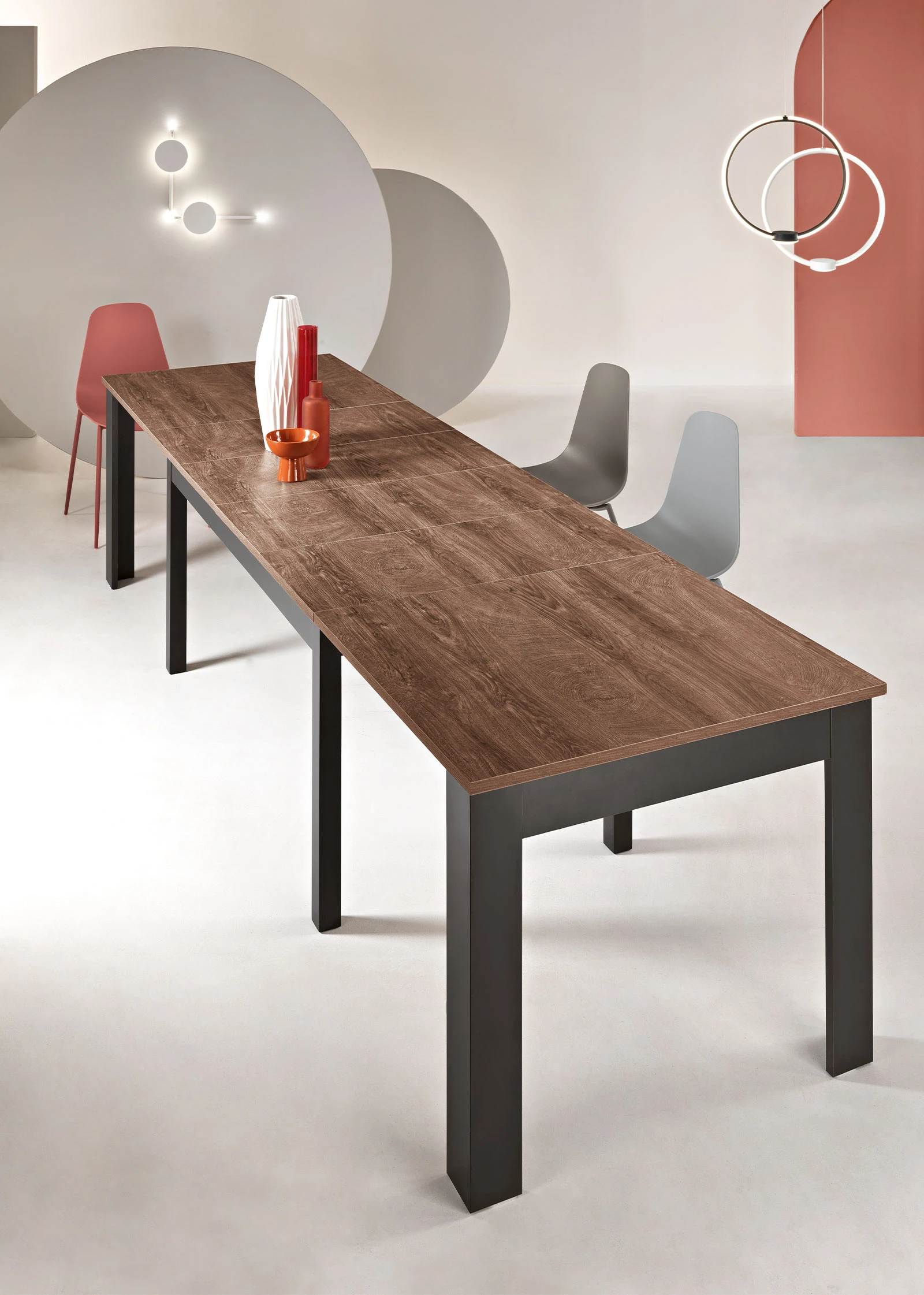 Tavolo allungabile con quattro allunghe centrali da 40 cm. Disponibile in diversi colori.