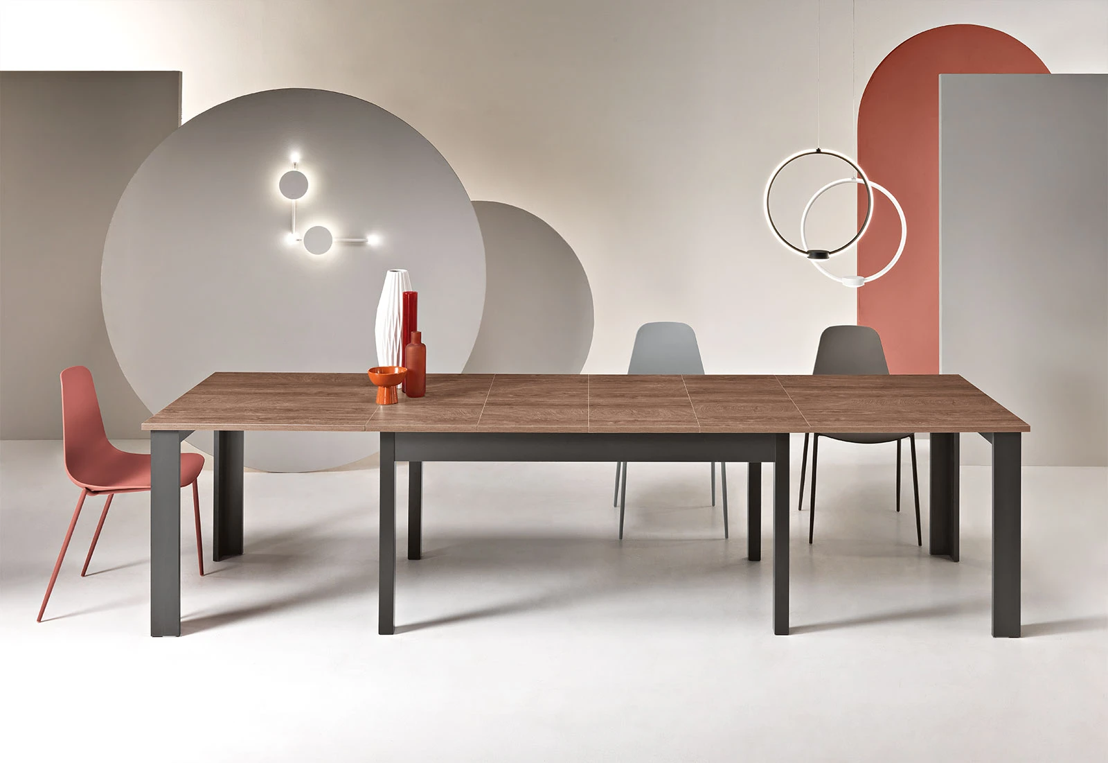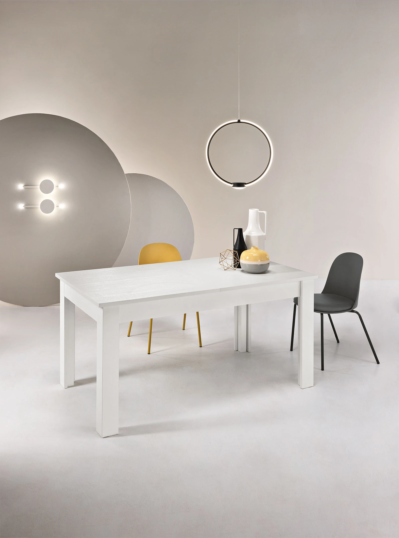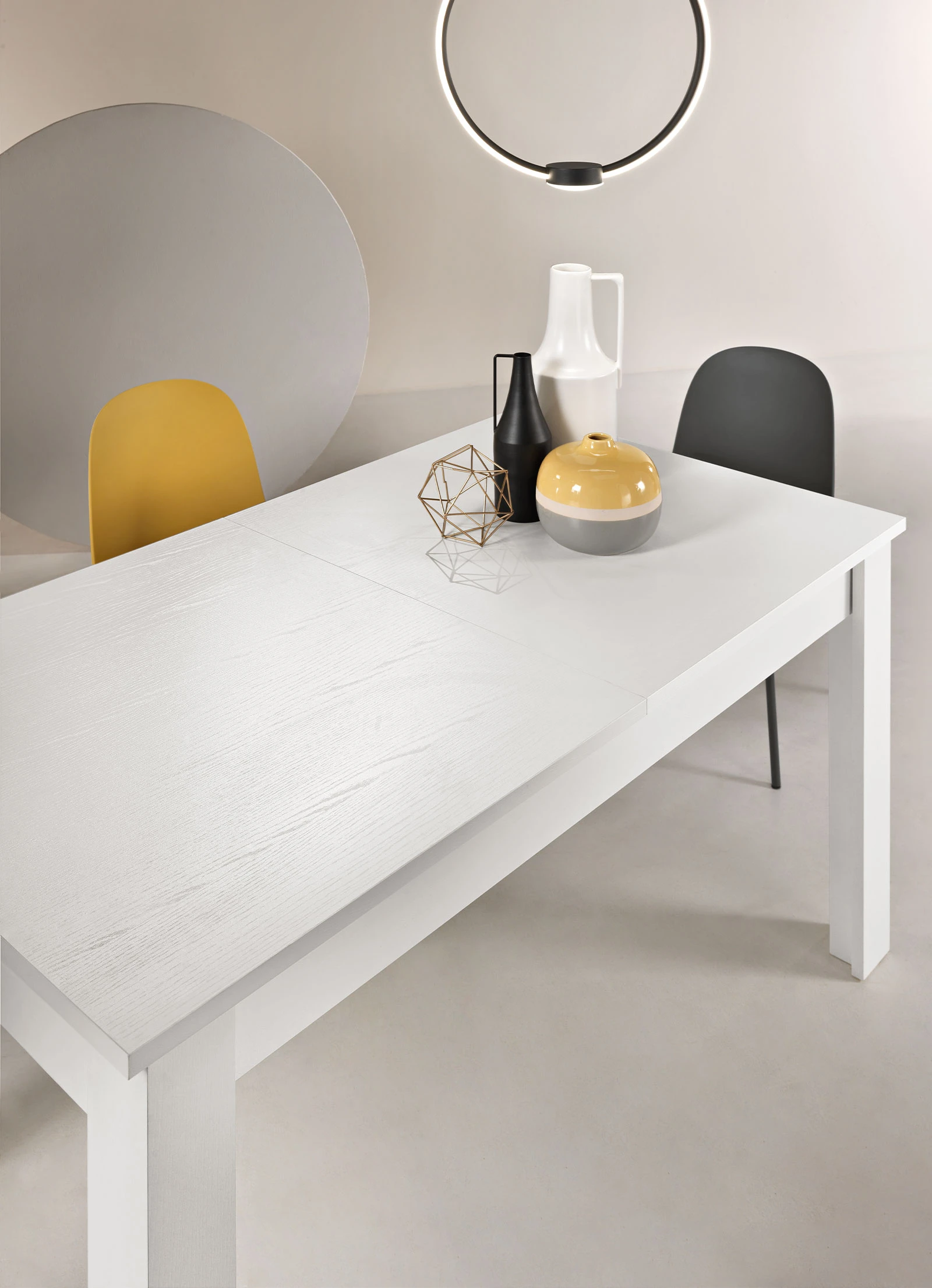 Tavolo allungabile con quattro allunghe centrali da 40 cm. Disponibile in diversi colori.