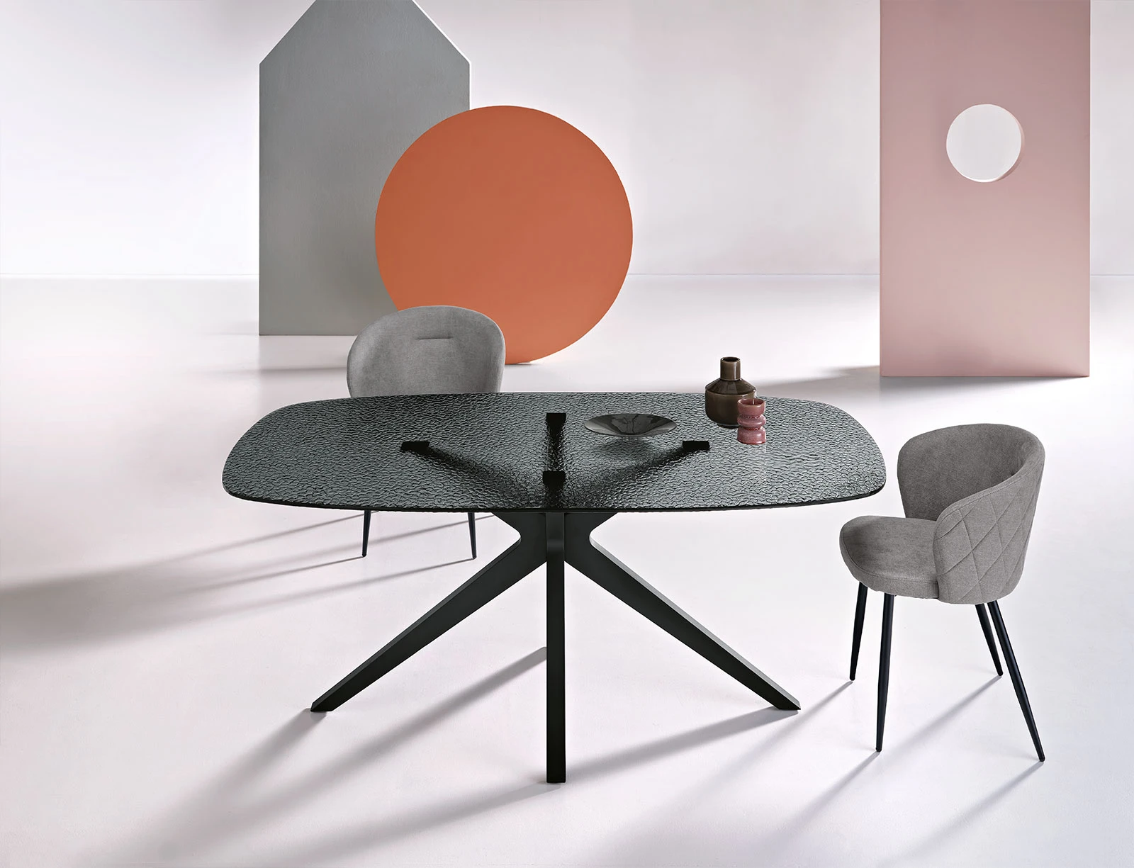 Tavolo con piano in vetro martellato fumè e base in metallo verniciato.