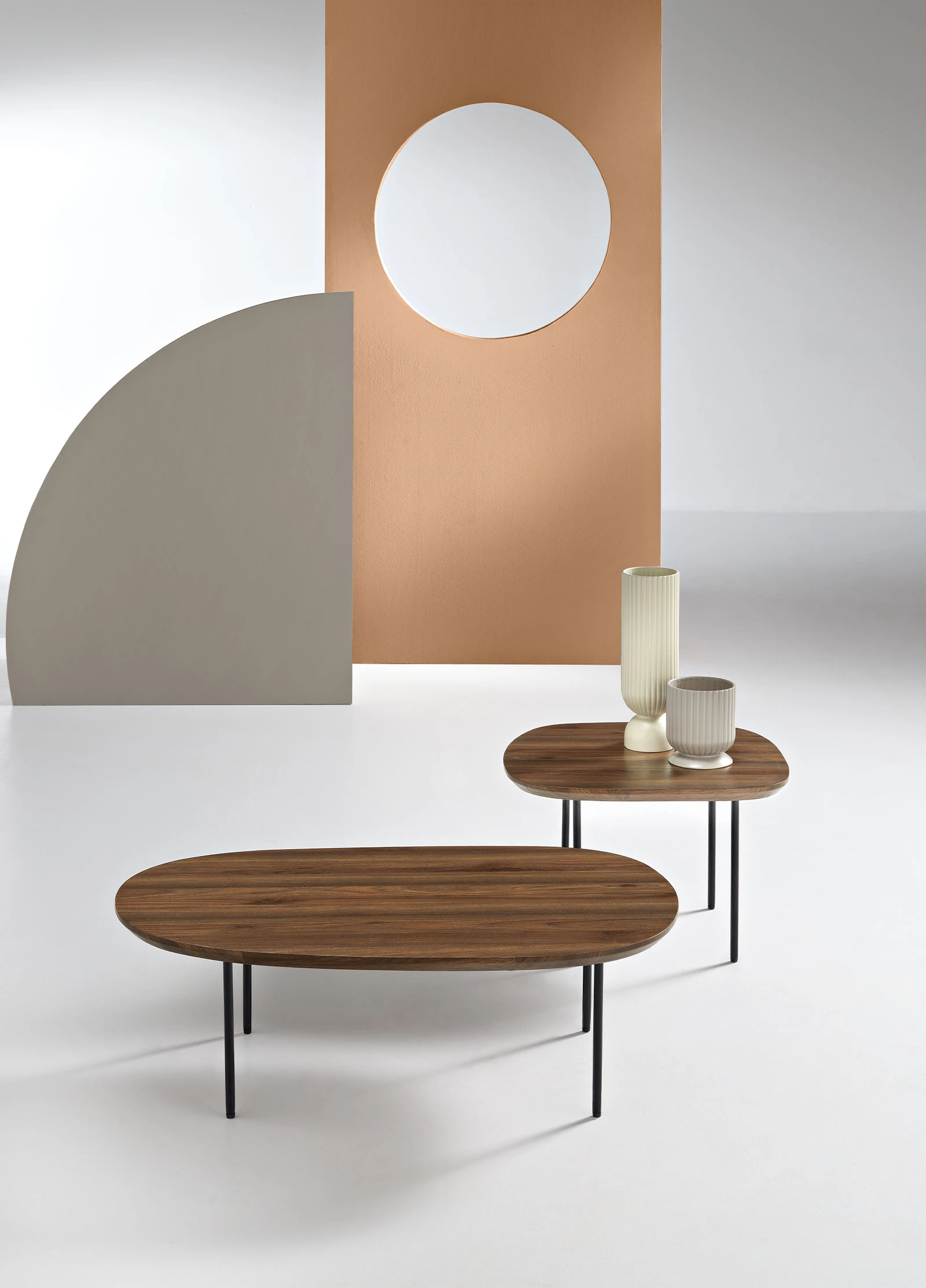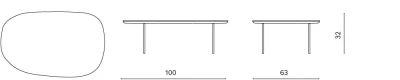 Tavolino con piano sagomato in MDF e gambe in metallo verniciato. Disponibile in diversi colori.