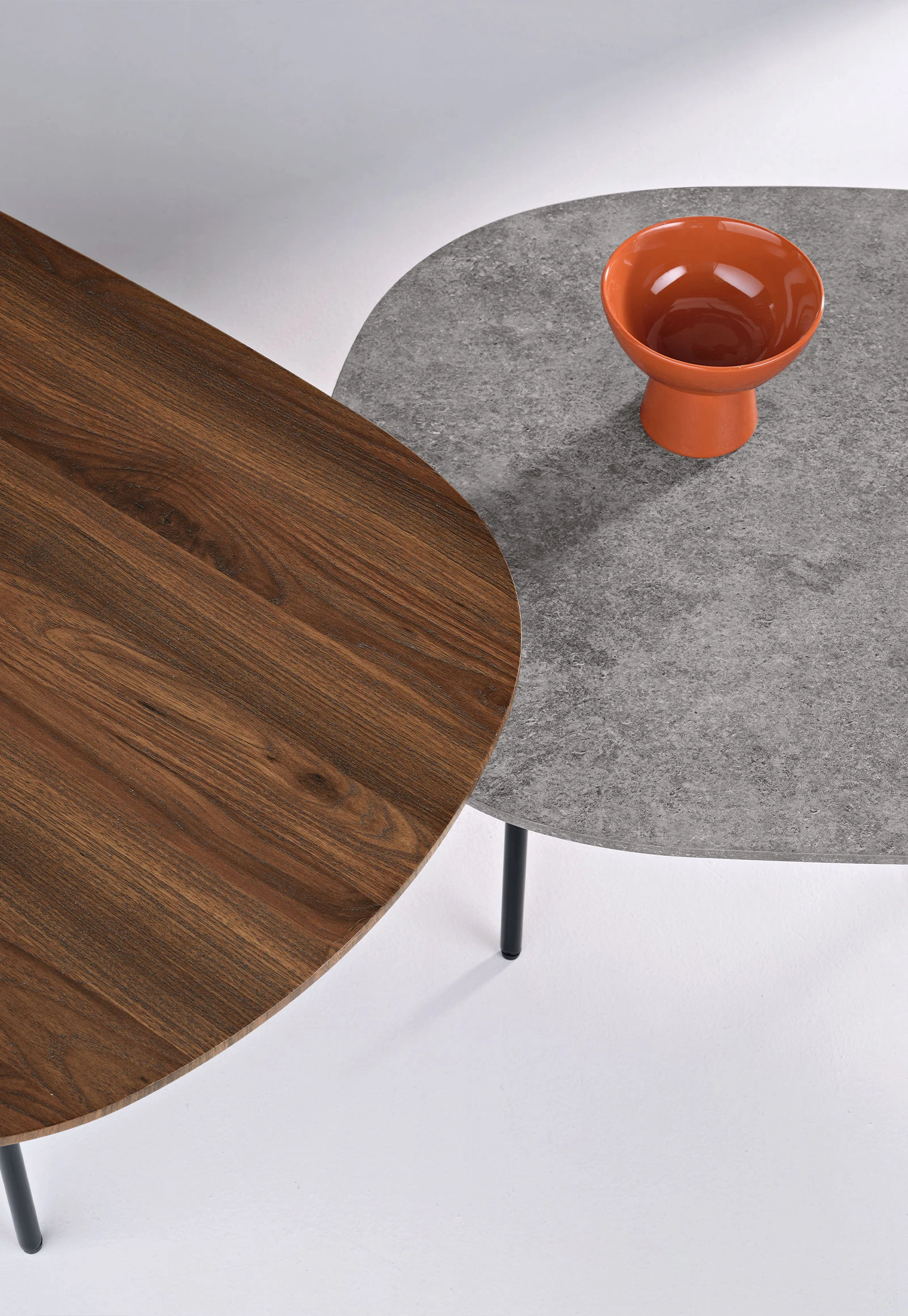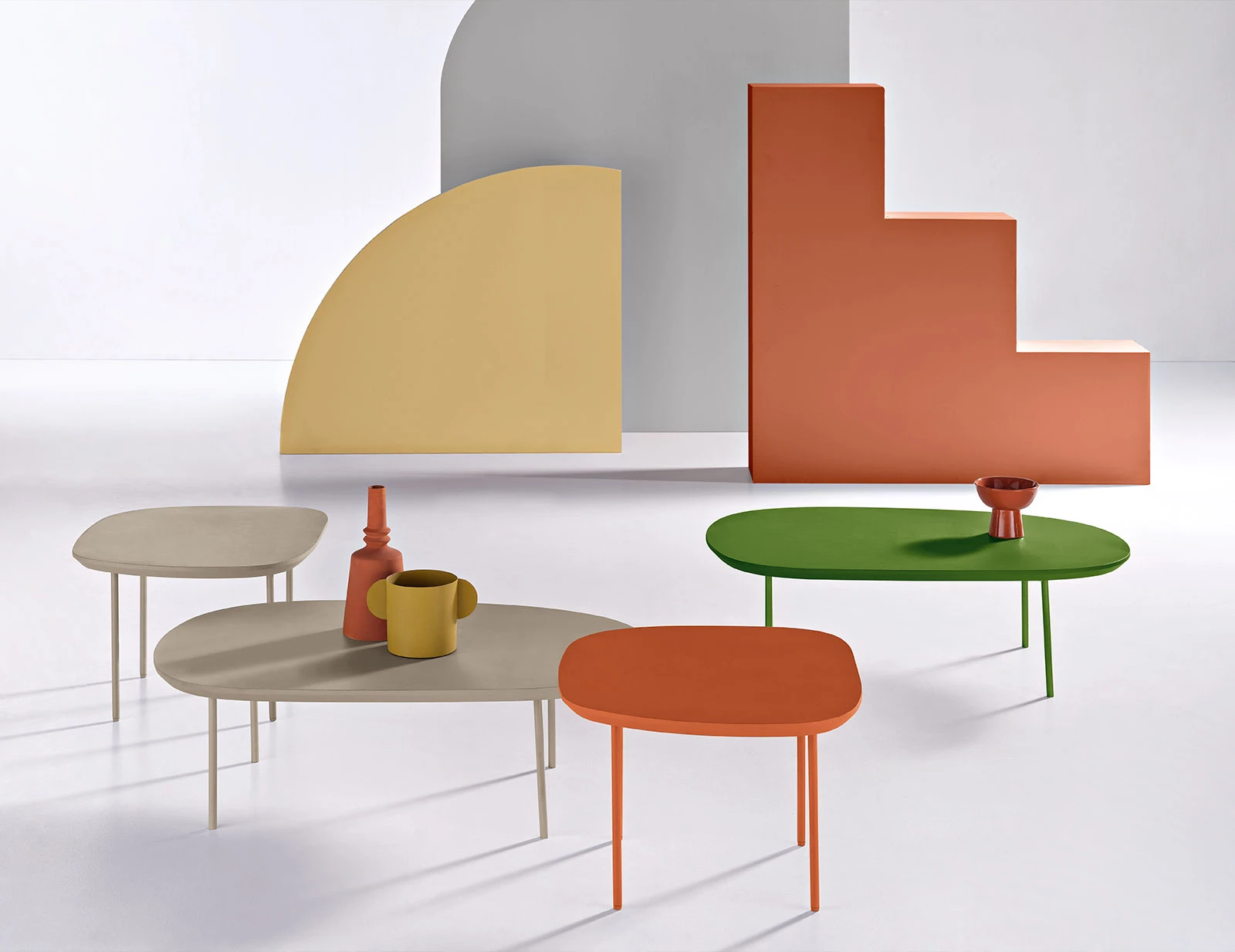 Tavolino con piano sagomato in MDF e gambe in metallo verniciato. Disponibile in diversi colori.