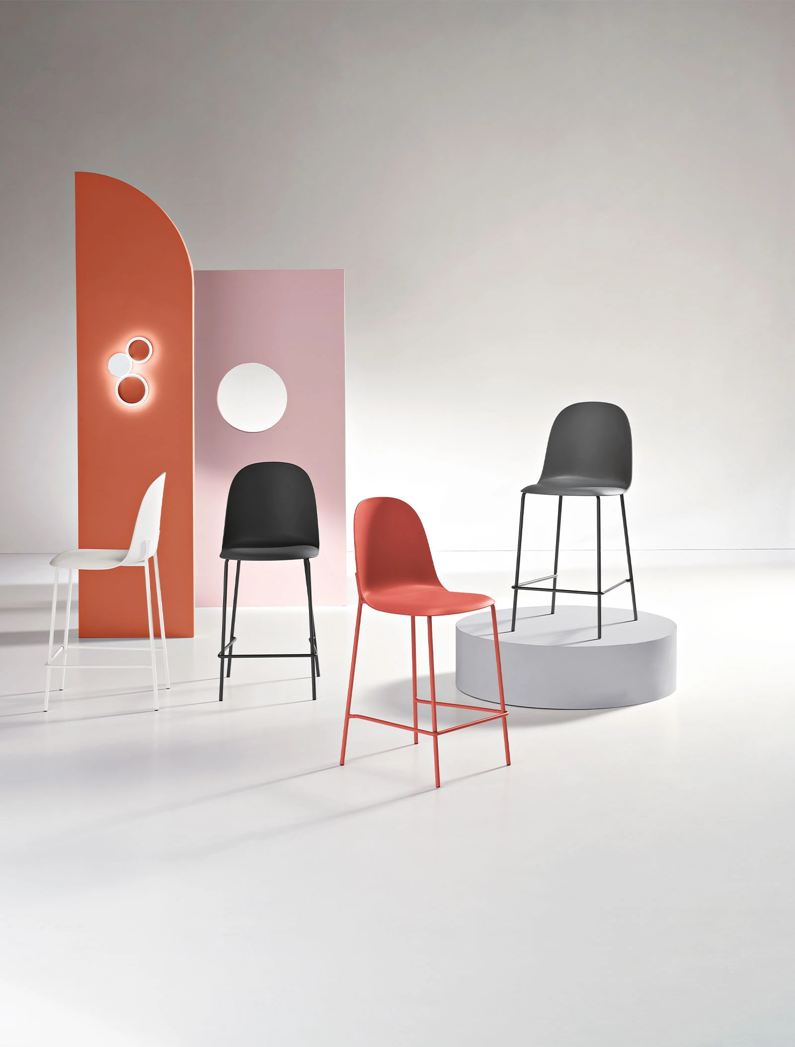 Sgabello in polipropilene con struttura in metallo. Disponibile in diversi colori.