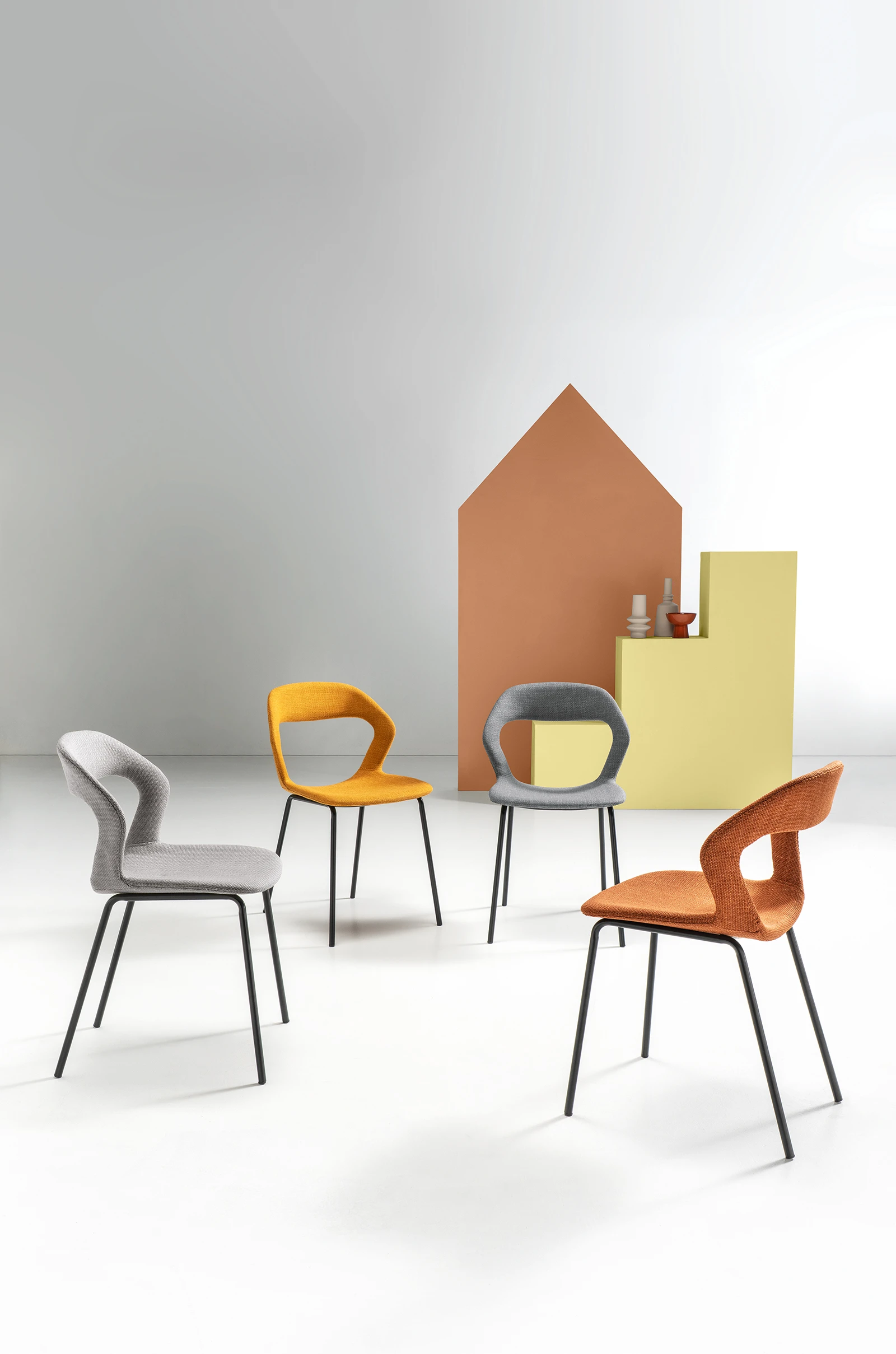 New inSedia imbottita in tessuto con struttura in metallo. Disponibile in diversi colori.