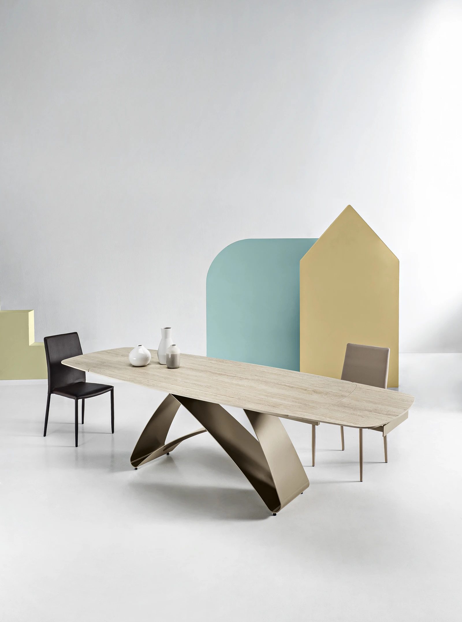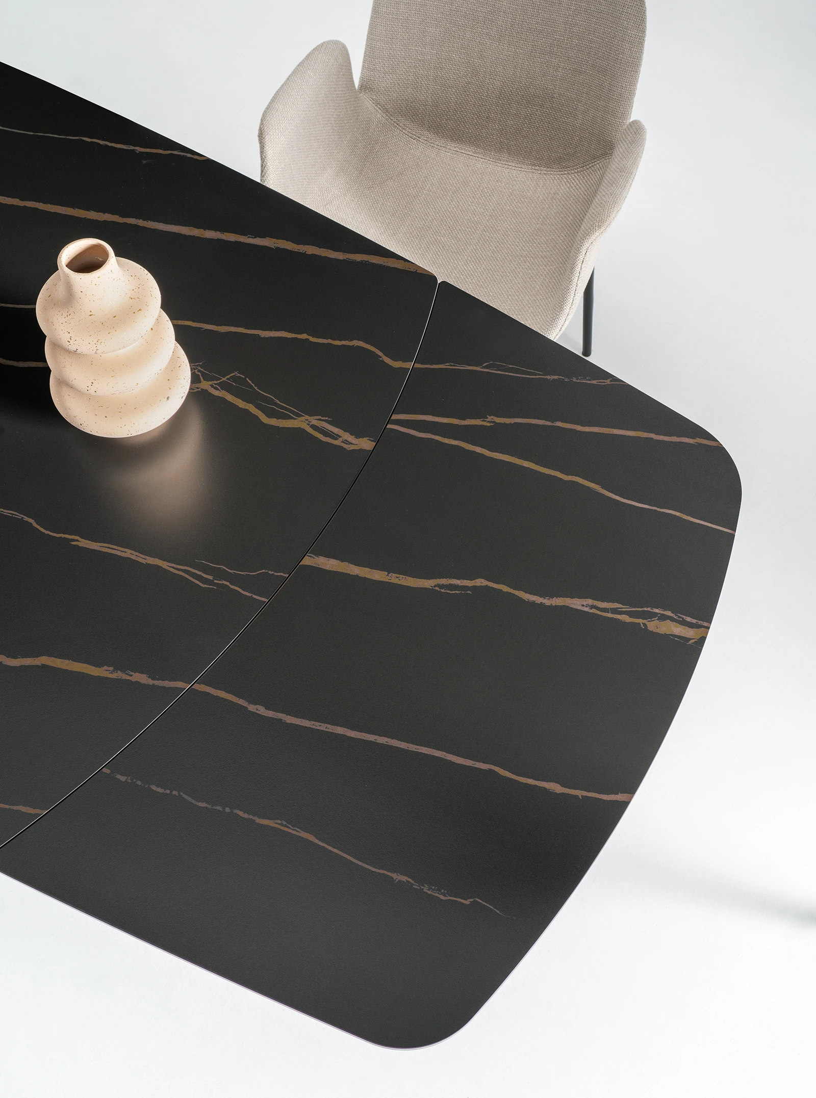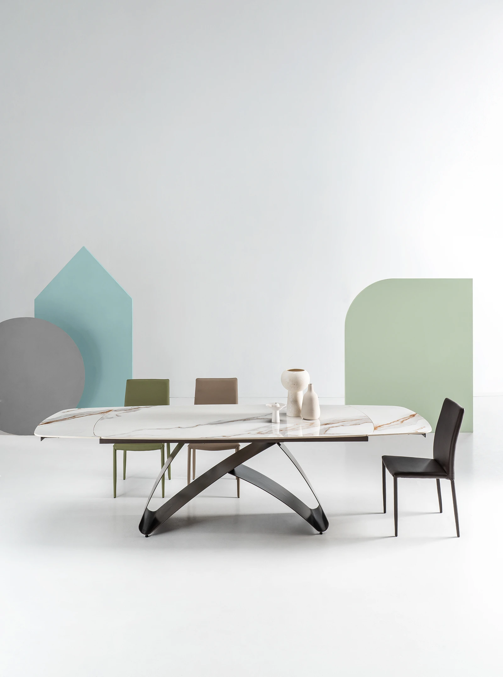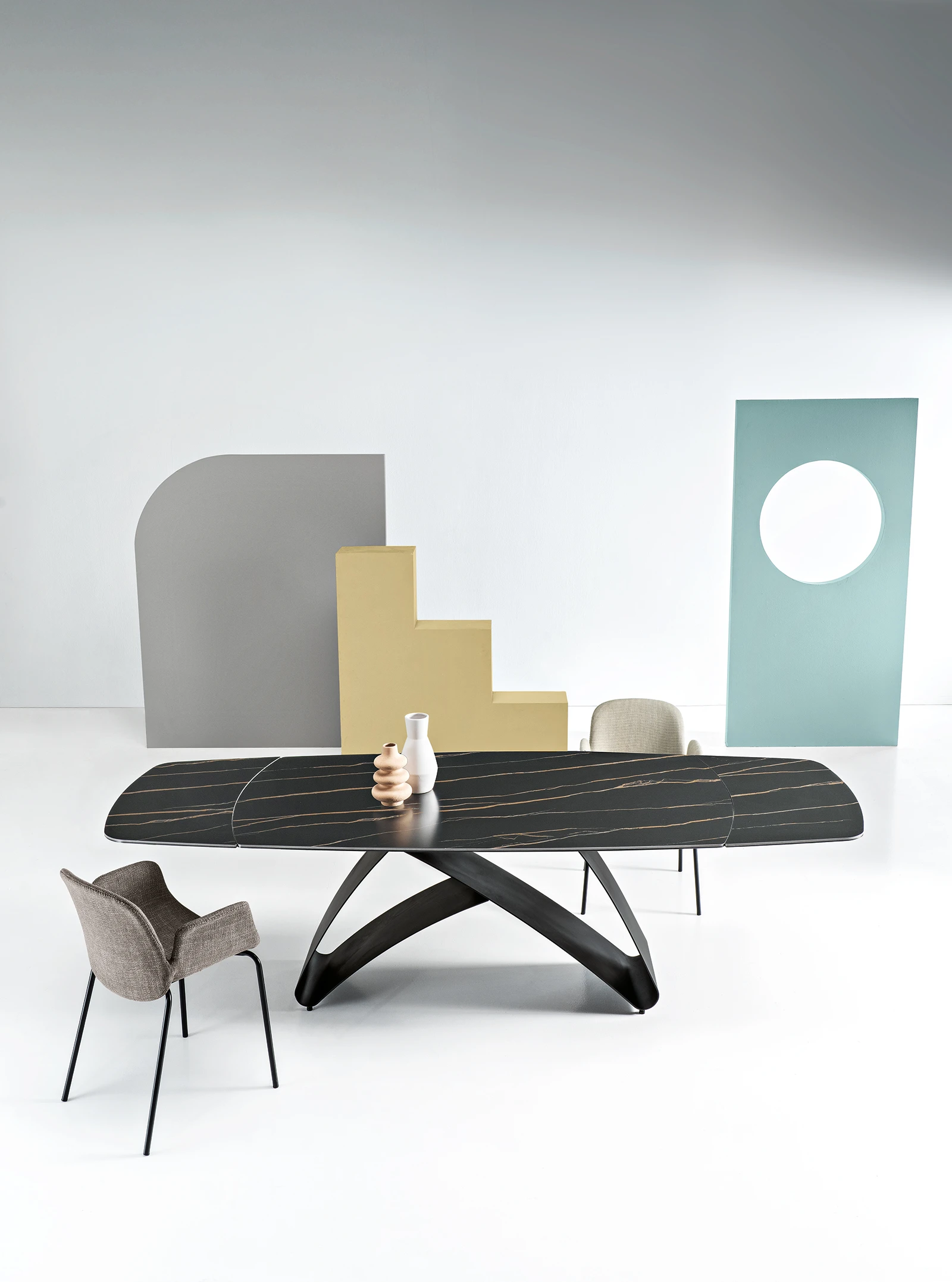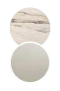 New inTavolo fisso in pietra sinterizzata effetto marmo con base in metallo verniciato.