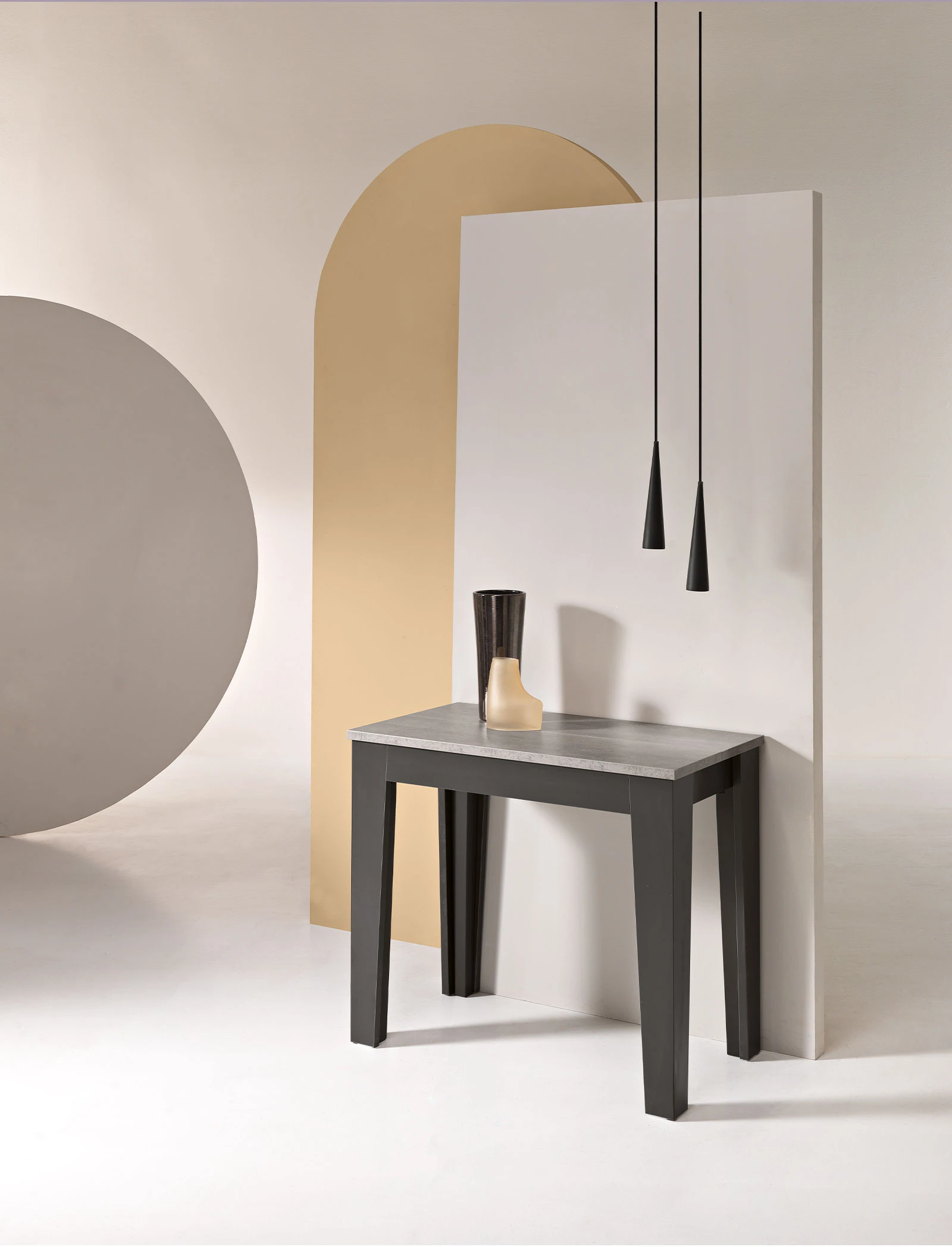 Tavolo consolle, allungabile con cinque allunghe centrali da 50 cm.