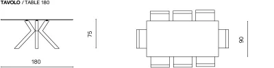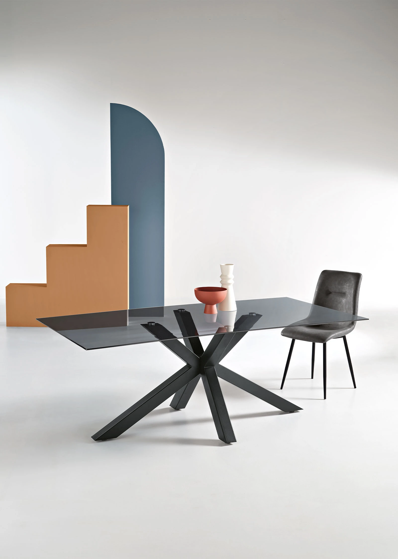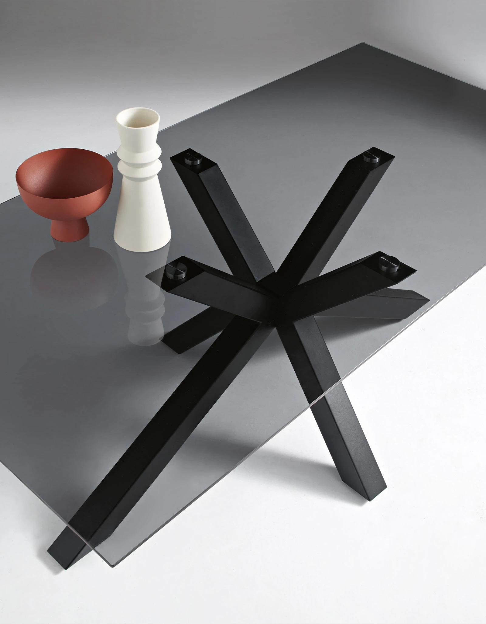 Tavolo fisso con piano in vetro e base in metallo. Disponibile in diverse misure e colori.