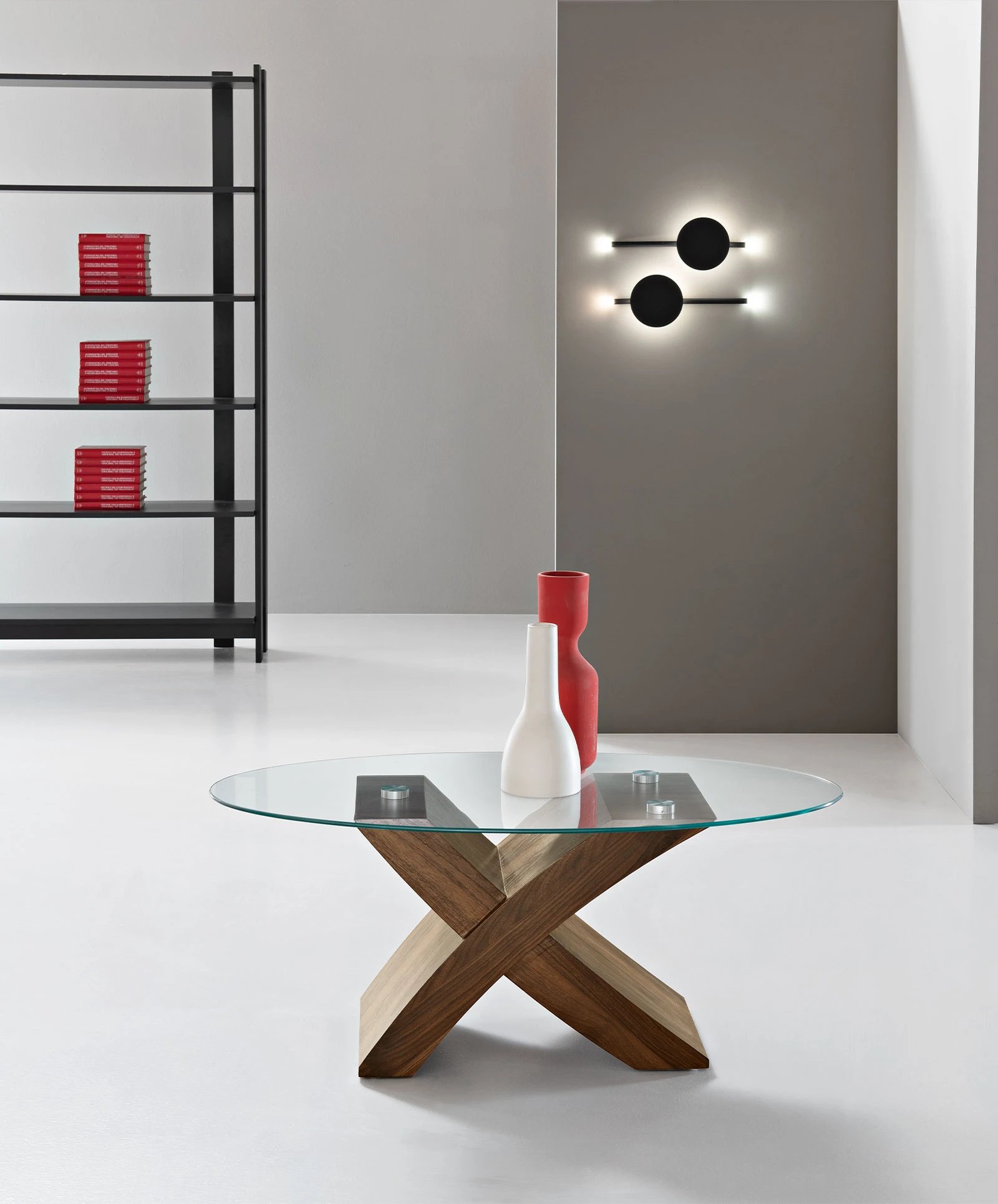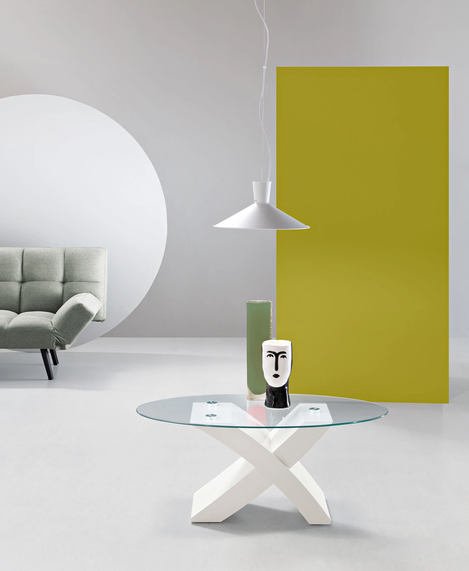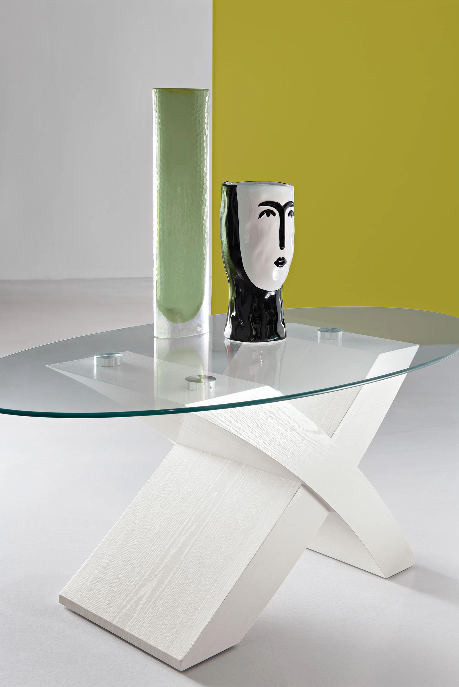 Tavolino ovale con piano in vetro. Disponibile in diversi colori.