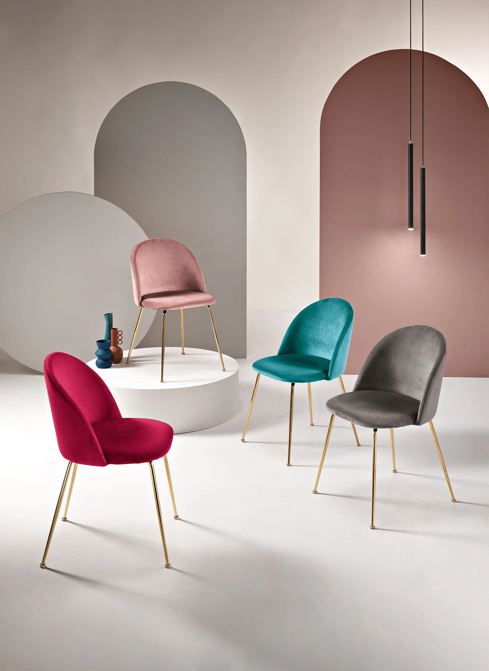 Sedia con struttura in metallo e seduta in velluto. Disponibile in diversi colori.